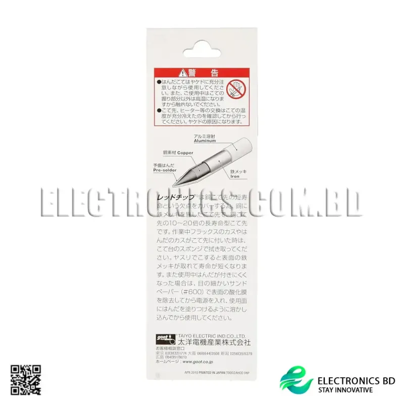 The Goot R-6BC is an original Japanese-made replacement soldering iron tip designed for precision and reliability. Its bevel (BC) type tip provides a larger surface area, ideal for general soldering applications. Engineered with a high-quality red-chip construction, it offers excellent heat conductivity and durability. Perfectly compatible with several Goot models including CA, KS, KYP, and SR series, this tip ensures smooth solder flow and long operational life, making it a dependable choice for professionals and hobbyists.